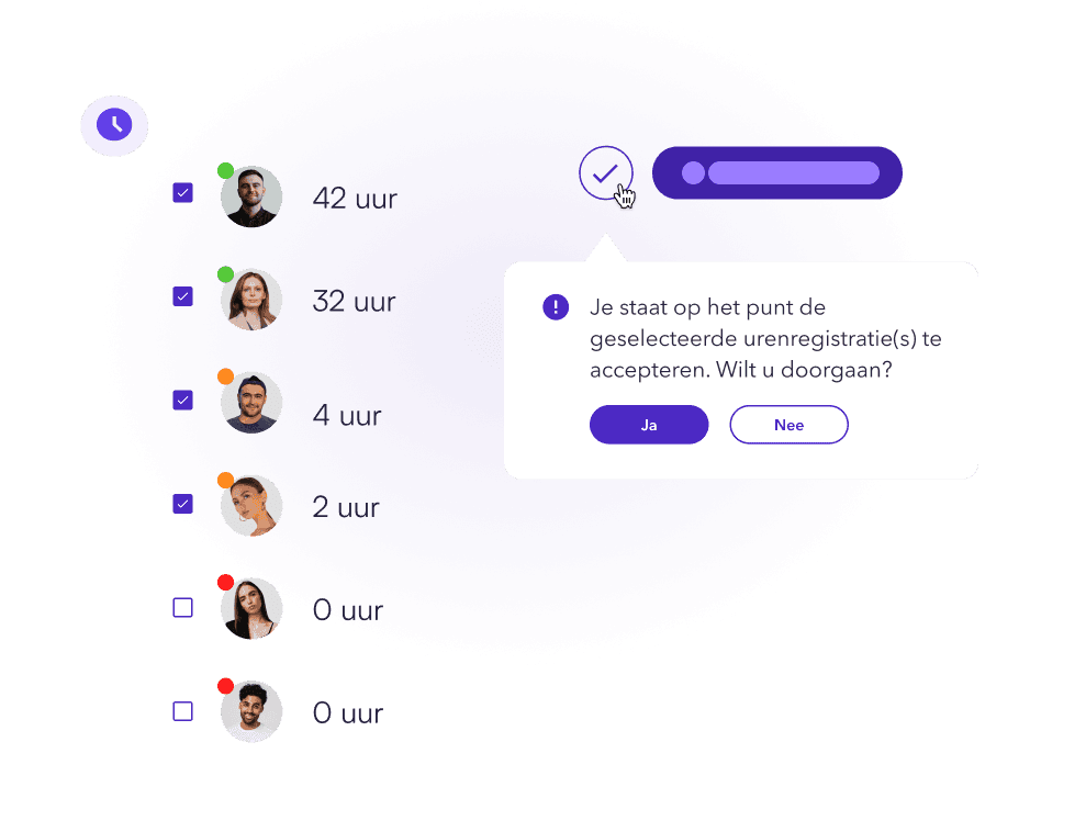 Werk met duidelijke statussen zoals open en geaccepteerd. Met slimme validaties voorkom je fouten voordat uren worden verwerkt.